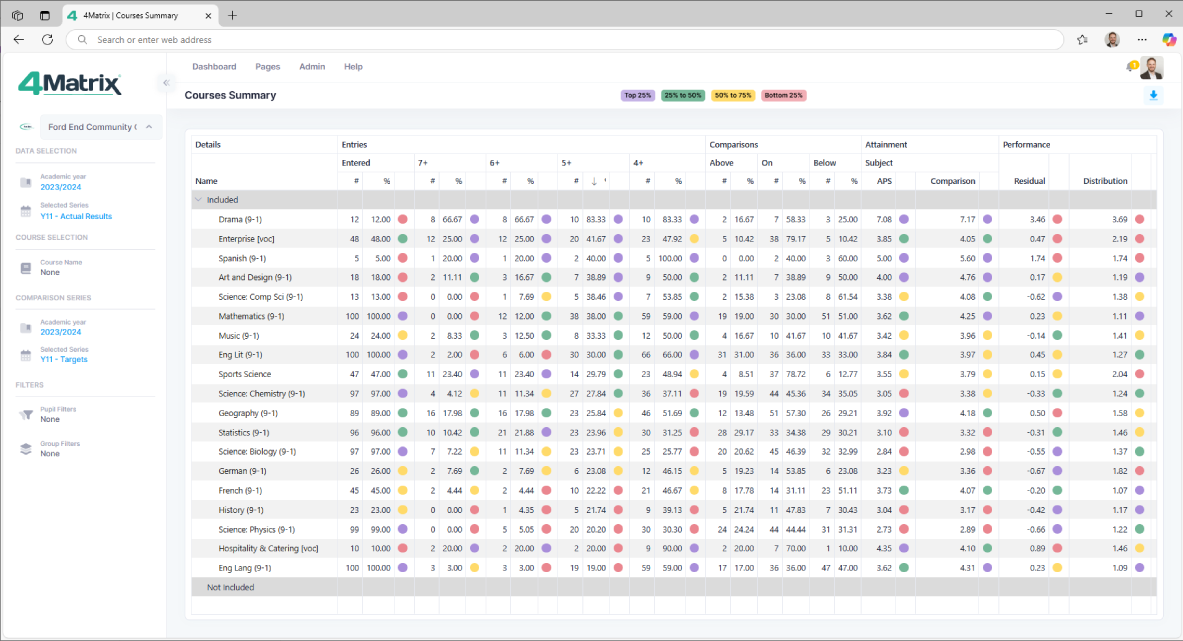4Matrix automatically accounts for DfE key performance indicators, with no additional programming required. More than 1000 qualifications, pre-set with the latest grades, points and performance measure flags are included in the 4Matrix system.