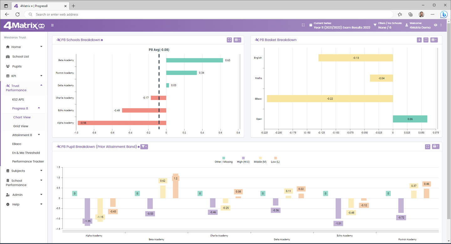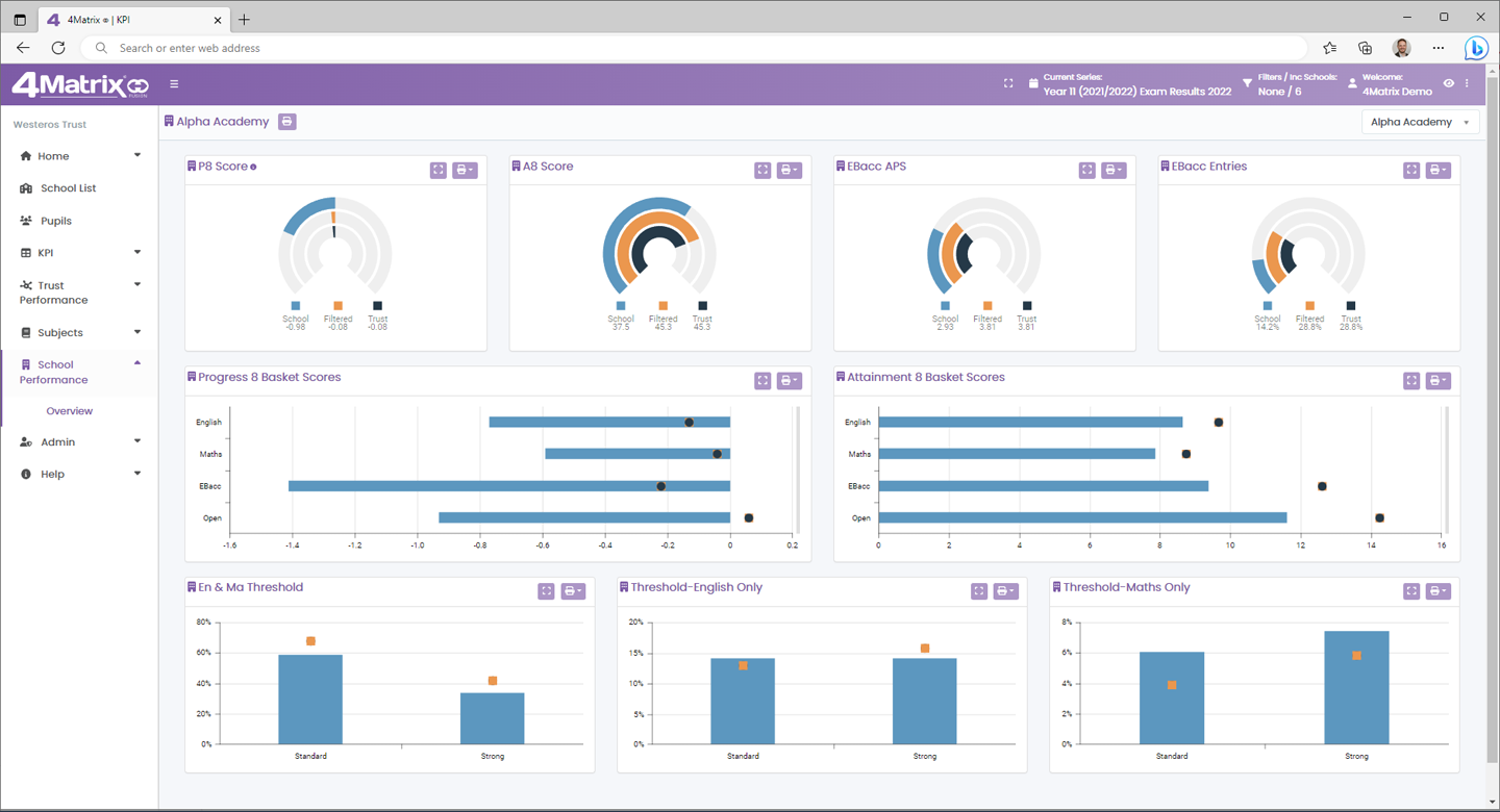 4Matrix Fusion is our cloud based, Multi Academy Trust analytics platform. It provides a clear picture of school performance across the Trust, reporting on attainment, progress and subjects for KS4 and KS5.